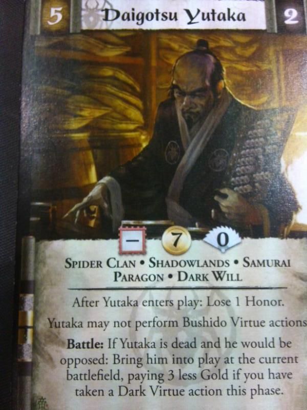 Battle: If Yutaka is dead and he would be opposed: Bring him into play at the current battlefield, paying 3 less Gold if you have taken a Dark Virtue action this phase.