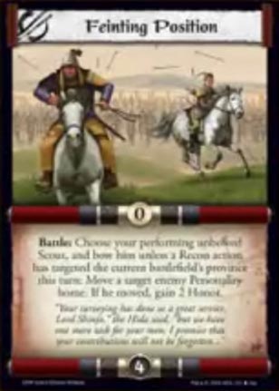 Batle: Target your performing unbowed Scout, and bow him uncles Recon action hes targeted a curennt batelfid province this turn: Mowe the target enemy personality home. If he mowed, gein 2 Honor.
