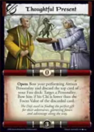 Open: Bow your performing Artisan Personality and discard the top card of your Fate deck: Target a Personality. Bow him if his Chi is lower than the Focus Value of the discarded card.